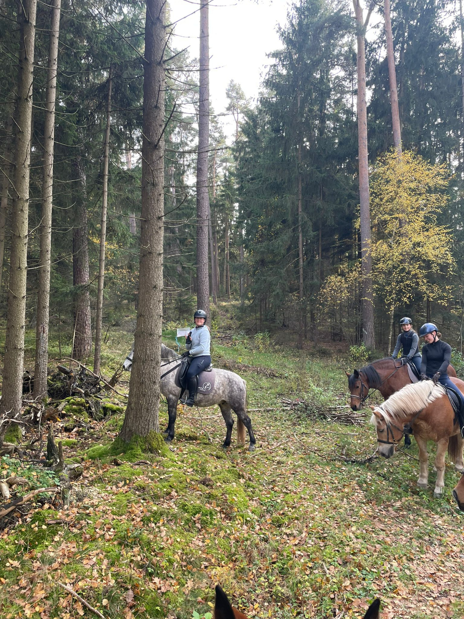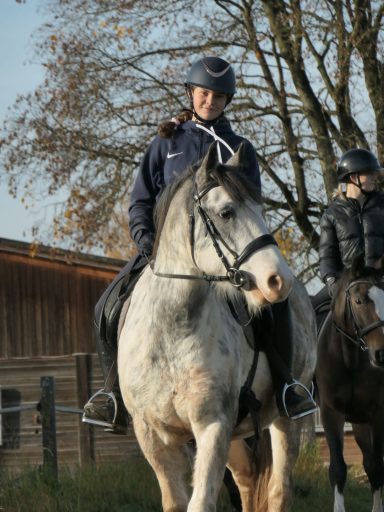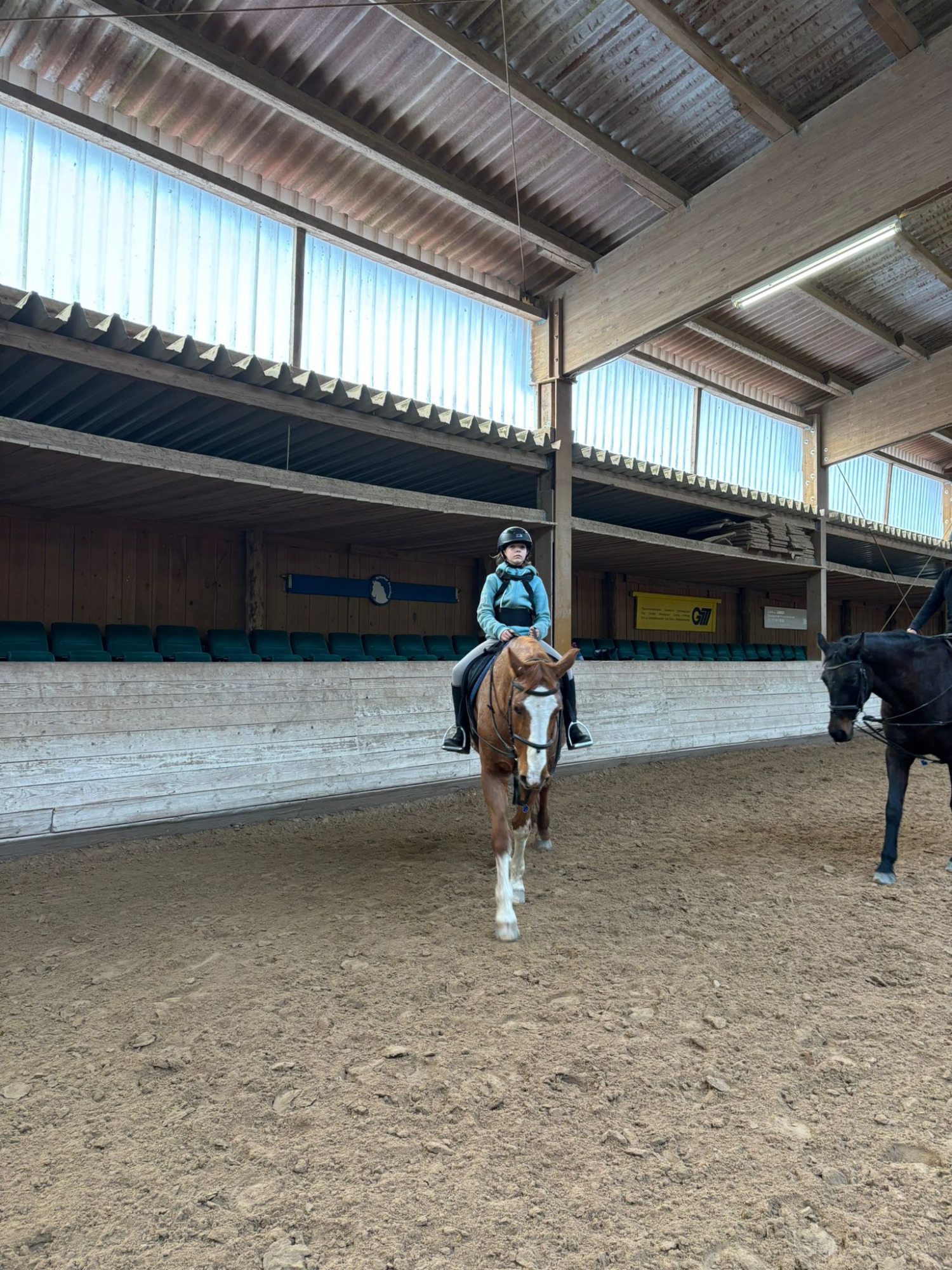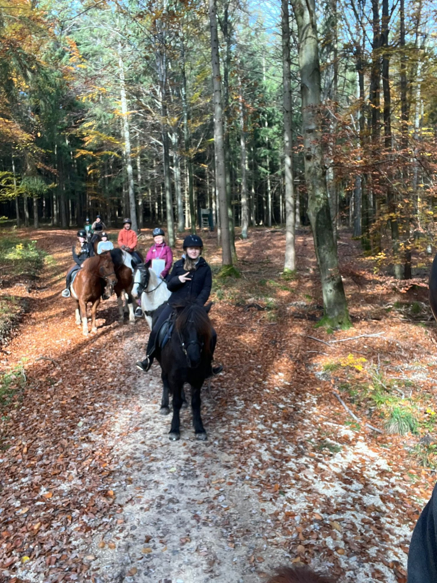 Bei der Schnitzeljagd um 10 Uhr gab es anfangs ein paar kleine Schwierigkeiten mit dem Stehenbleiben, und Ginger suchte kurzzeitig die Wiese auf. Doch die Reiterin brachte alles schnell wieder in Ordnung, und der Rest der Schnitzeljagd verlief mit nur kleinen Herausforderungen sehr gut – die Gruppe kam sicher und fröhlich am Hof zurück.