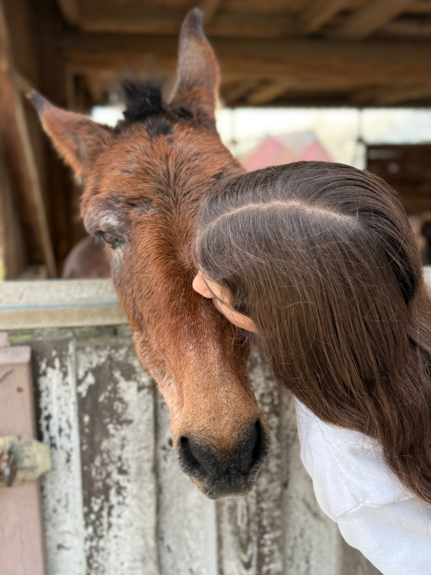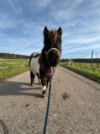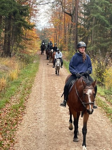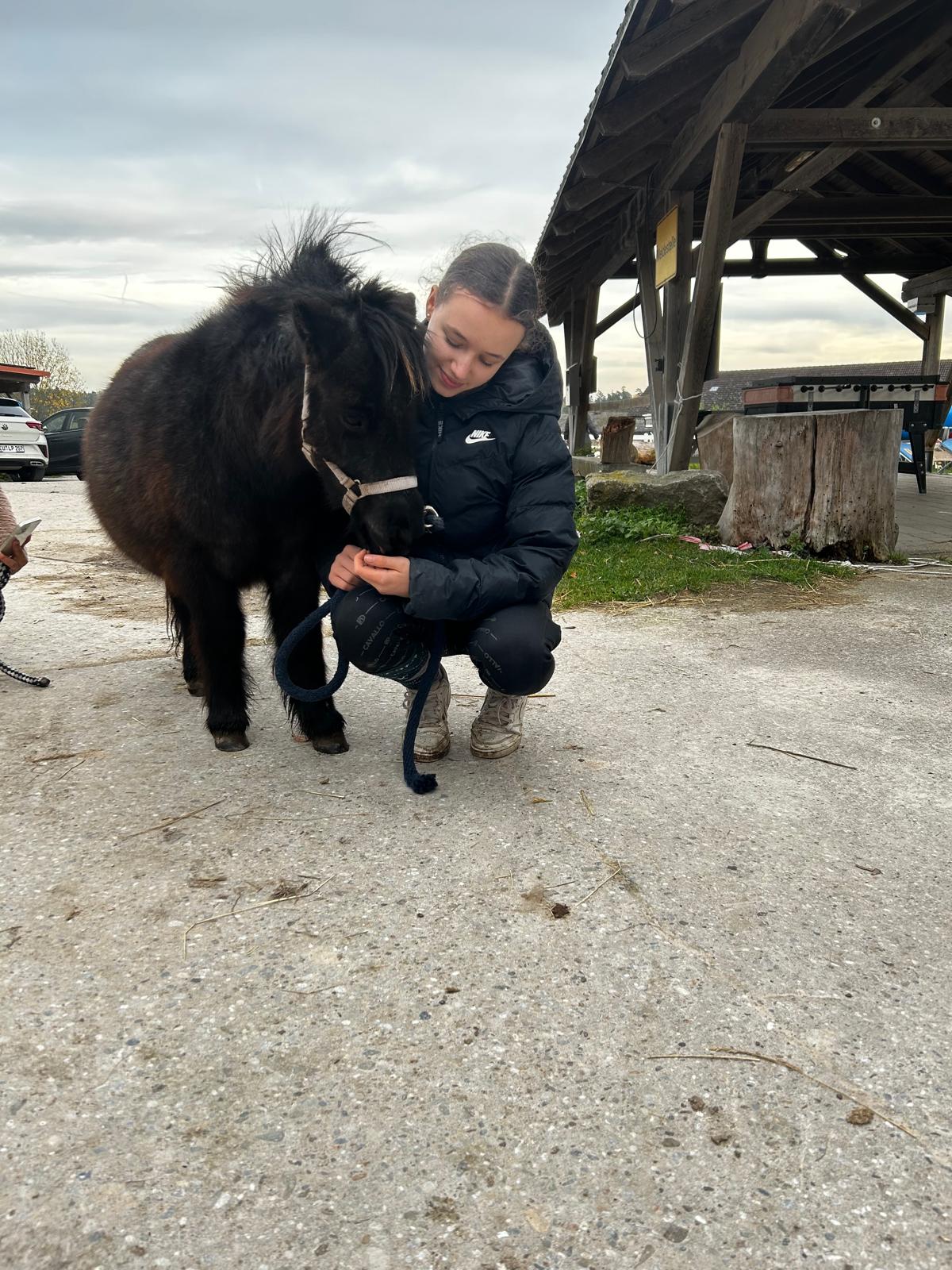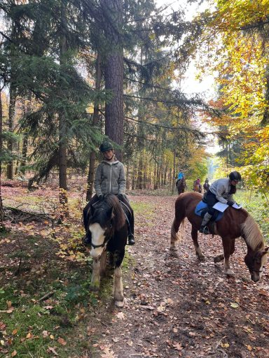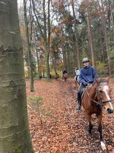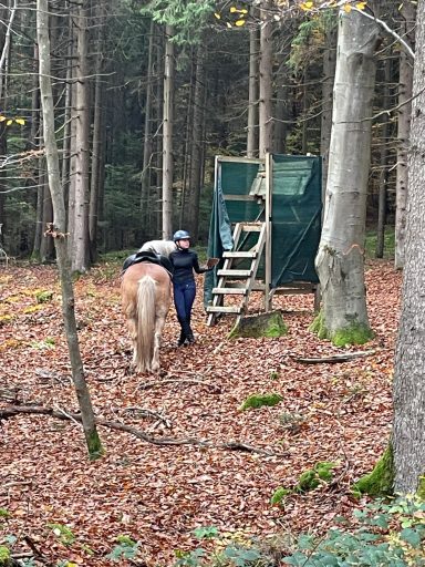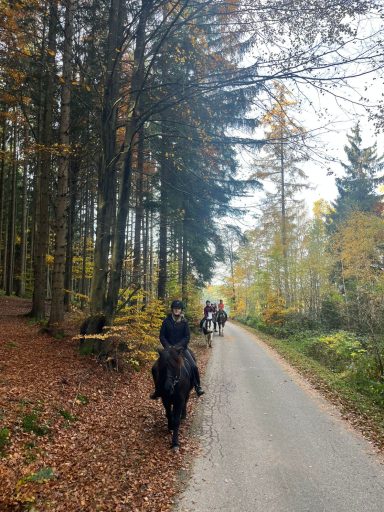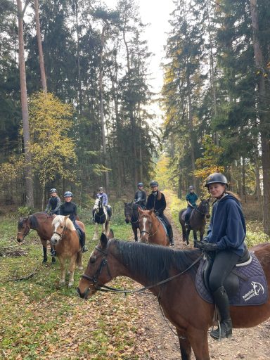 Bei der Schnitzeljagd um 10 Uhr gab es anfangs ein paar kleine Schwierigkeiten mit dem Stehenbleiben, und Ginger suchte kurzzeitig die Wiese auf. Doch die Reiterin brachte alles schnell wieder in Ordnung, und der Rest der Schnitzeljagd verlief mit nur kleinen Herausforderungen sehr gut – die Gruppe kam sicher und fröhlich am Hof zurück.