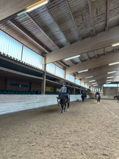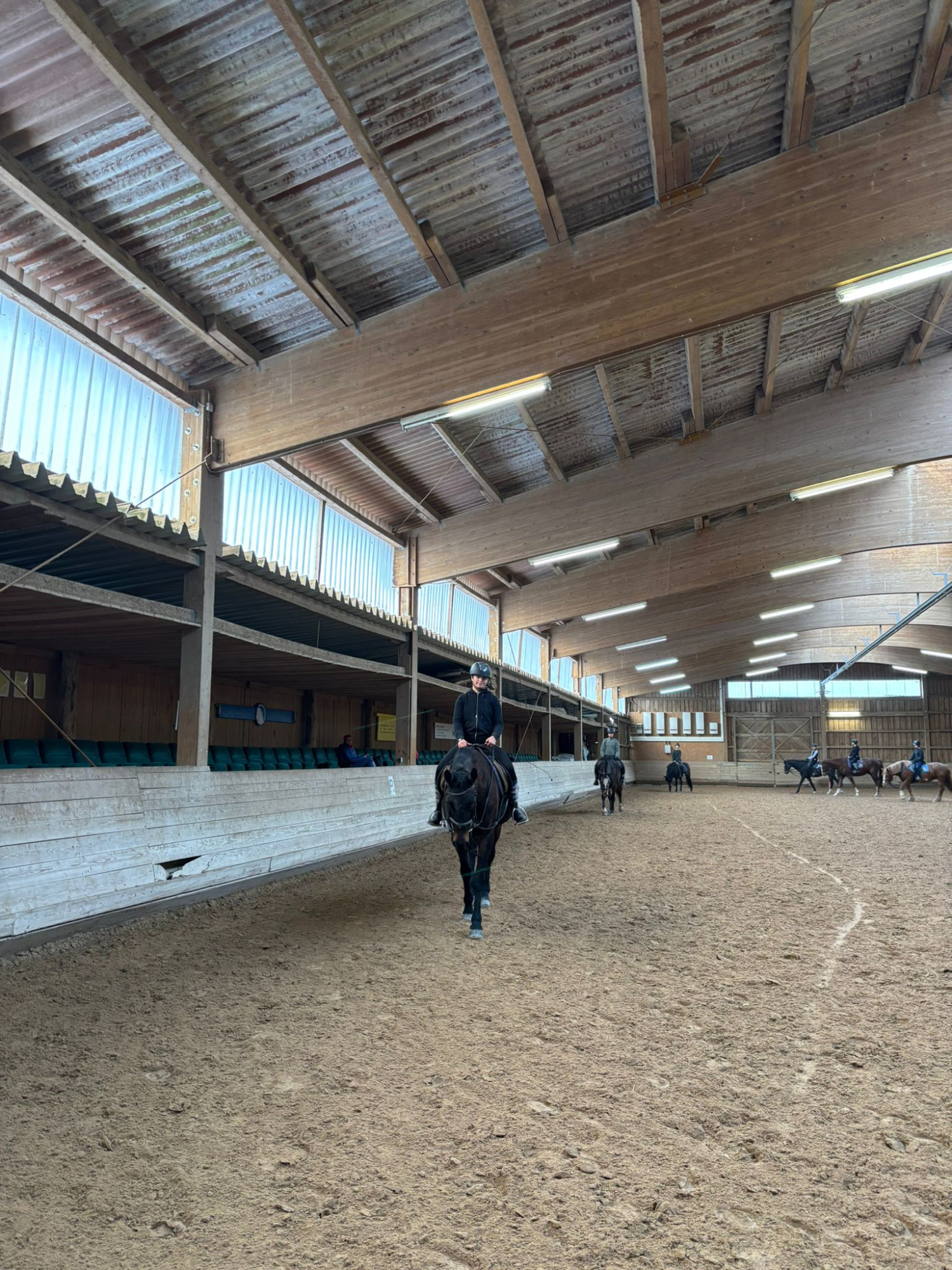 Die Halle um 14:30 Uhr hat fleißig an den Übergängen zwischen Schritt und Trab gearbeitet. Mit etwas Übung funktionierte das schon richtig gut, sodass einige Reiterinnen und Reiter sogar den Galopp mit einbauen konnten.