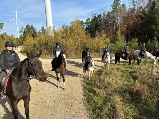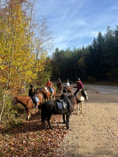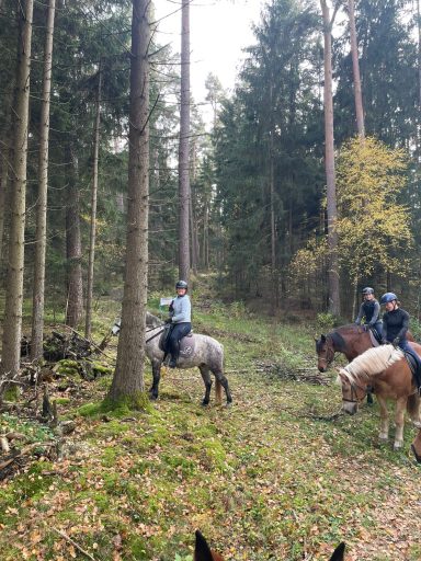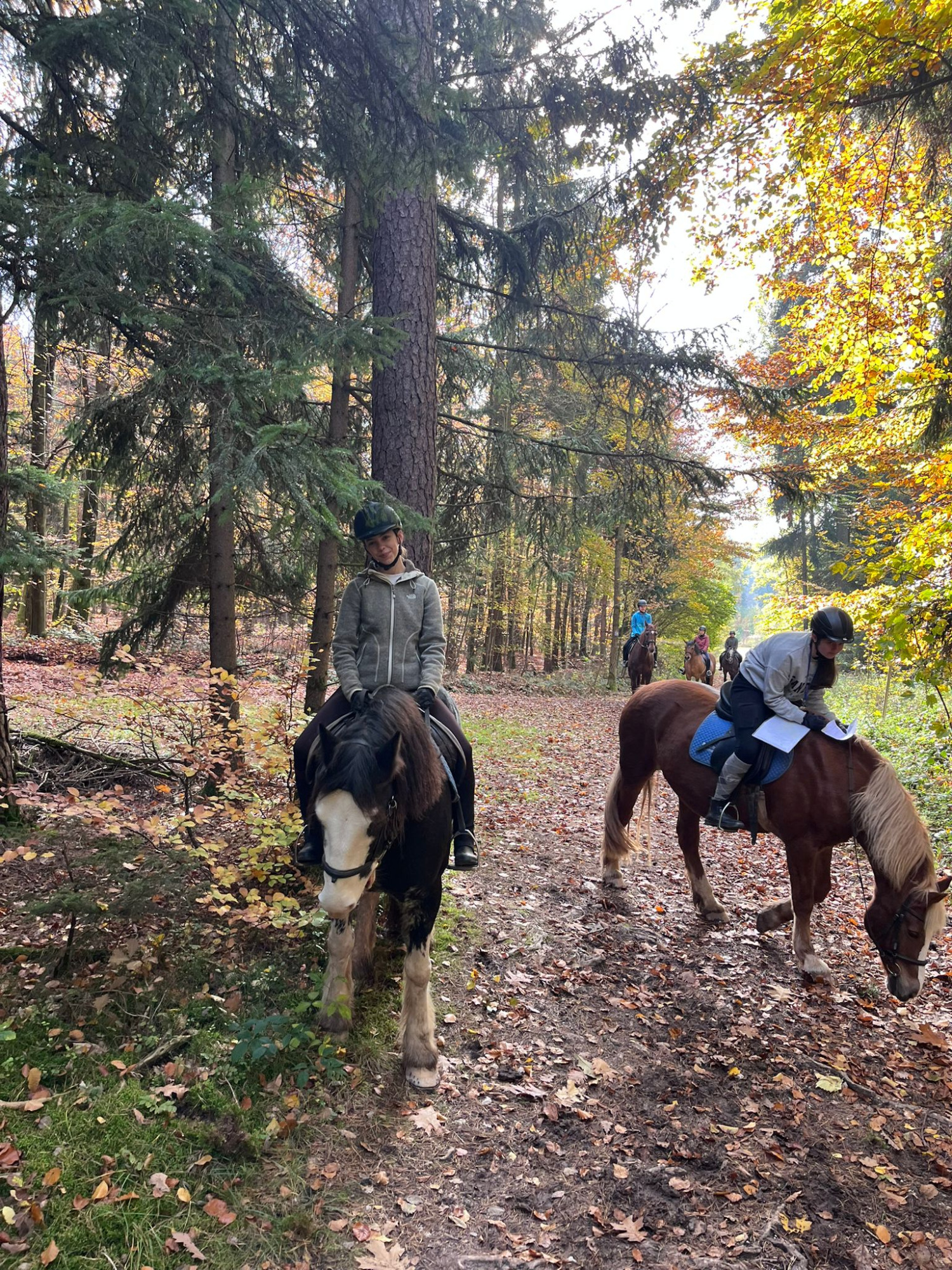 Am Nachmittag machte die Gruppe G2 den Wald unsicher. Vor den Galoppstrecken wurde noch eifrig diskutiert, damit wirklich alle vorher sicher im Trab ritten. Die Pferde hätten am liebsten einen Schnellstart aus dem Schritt hingelegt, aber die Reiterinnen und Reiter blieben ruhig, ritten sauber in den Trab und konnten dann sicher in den Galopp übergehen.