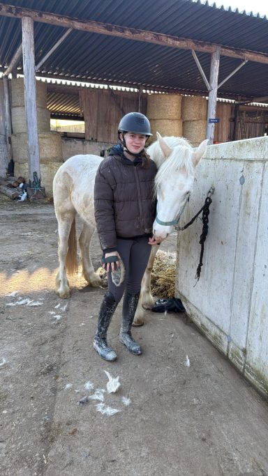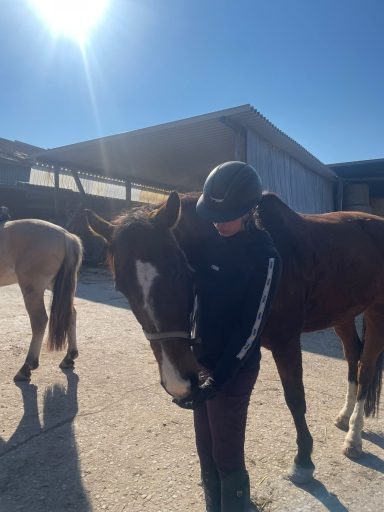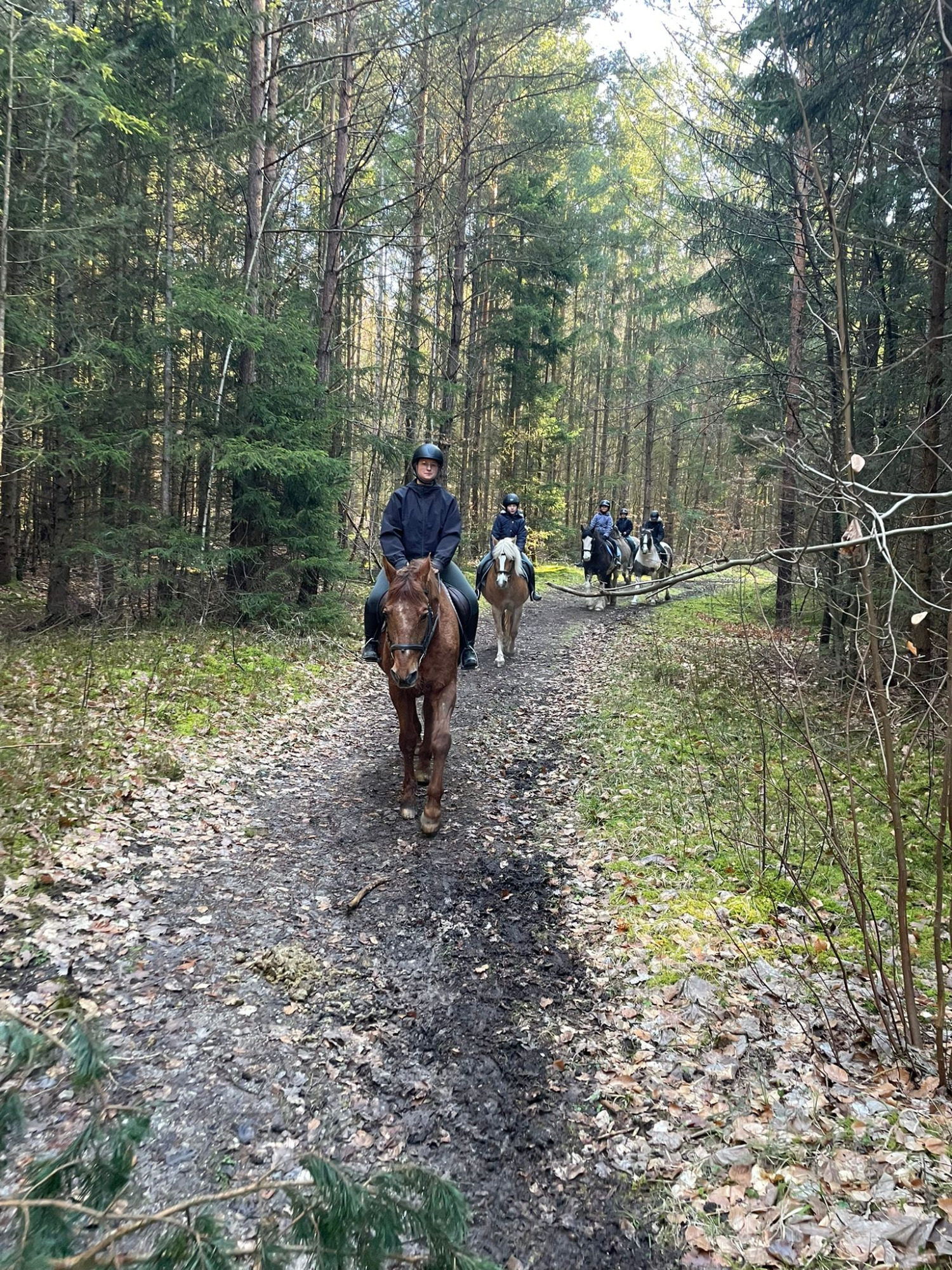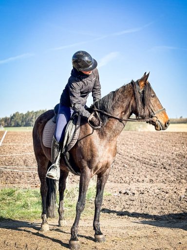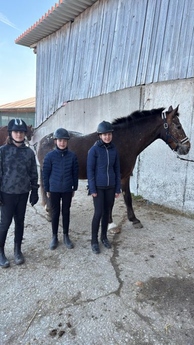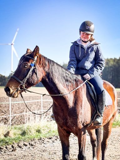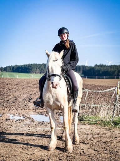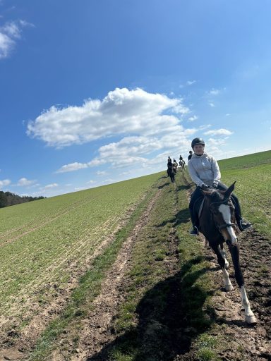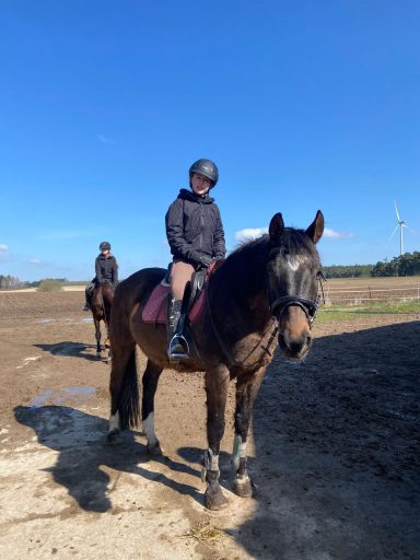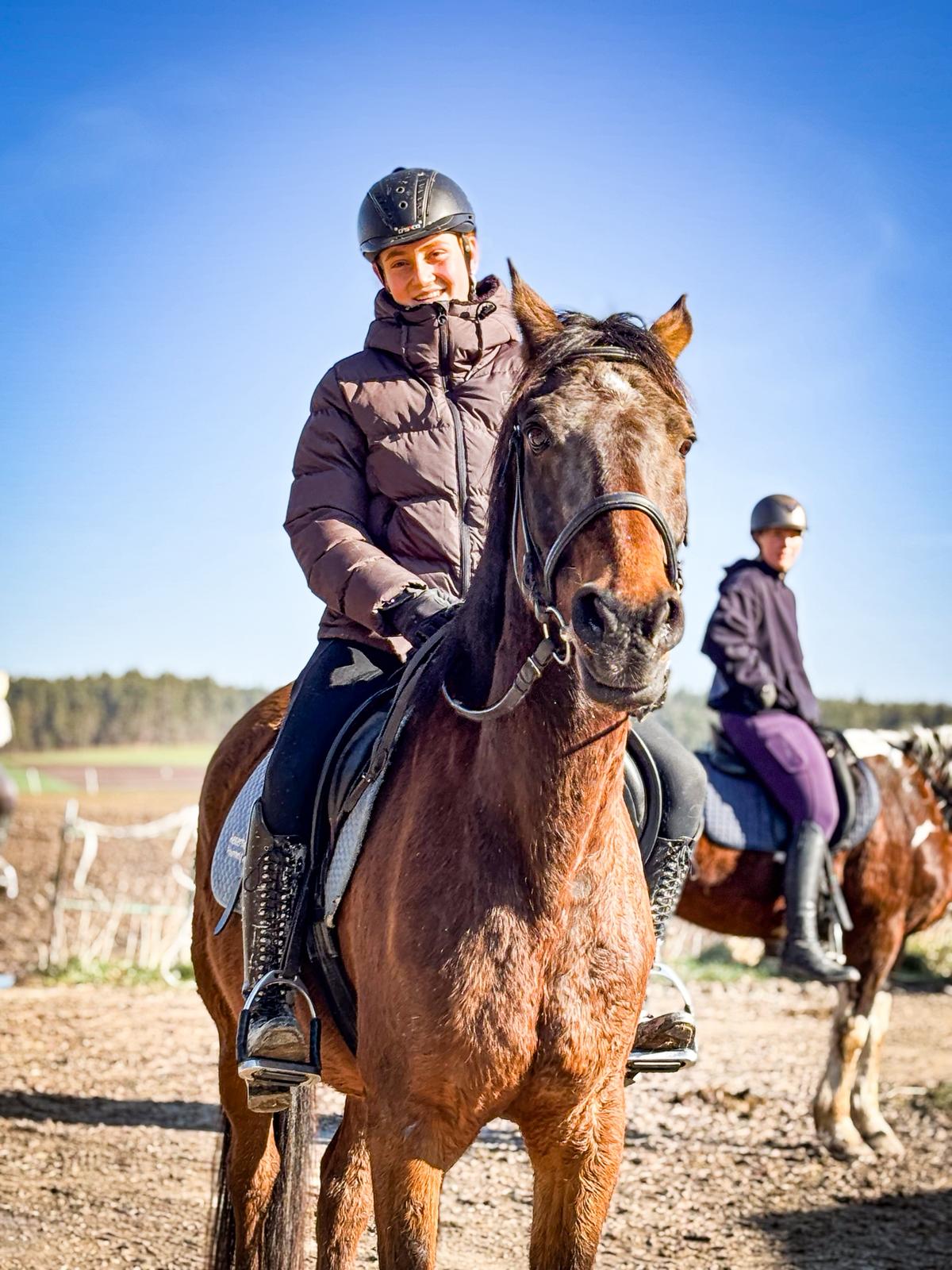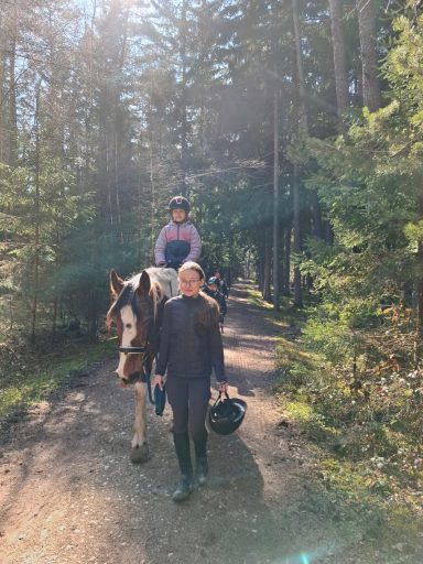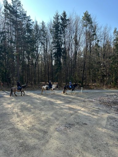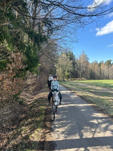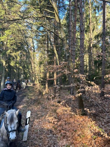 Die G3 konnte am Morgen einen gemütlichen Ausritt genießen. Als an der Straße ein Auto vorbeifuhr, erschrak Hermine kurz und sprang über einen Graben sowie einen Baumstamm. Reiterin Julia W. blieb jedoch ruhig und gelassen, saß sicher im Sattel und konnte sich schnell wieder der Gruppe anschließen. Prima gemacht!