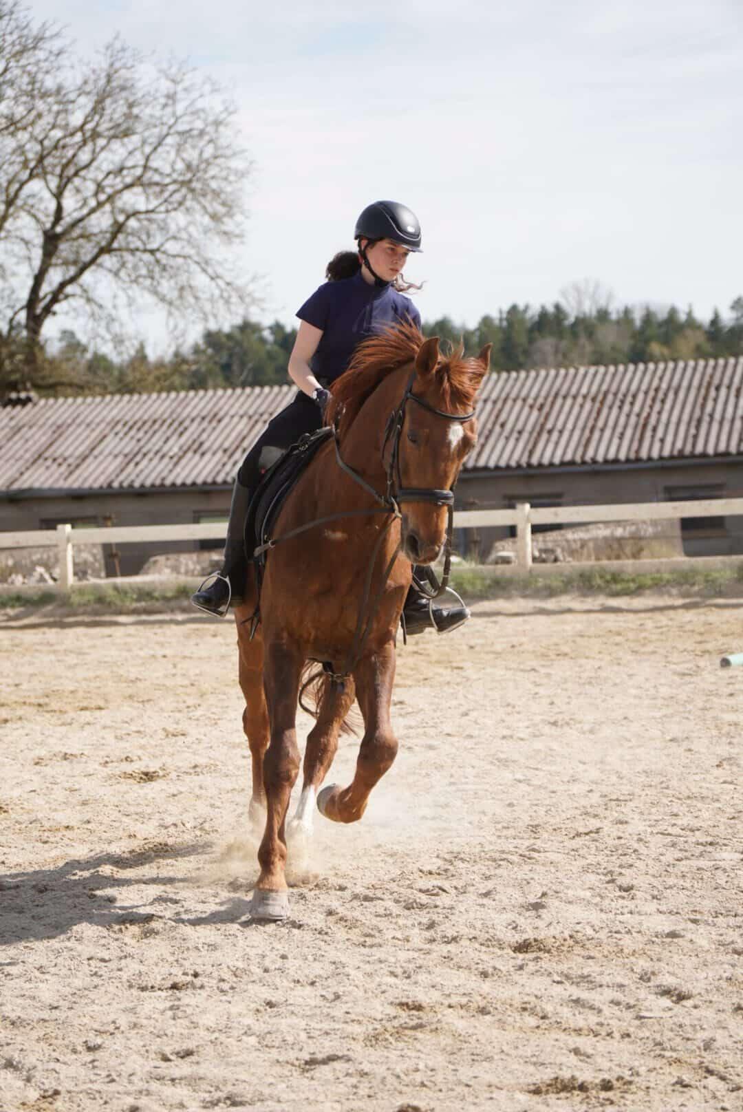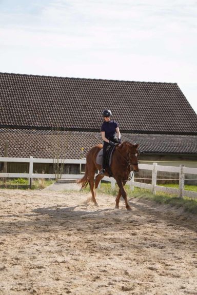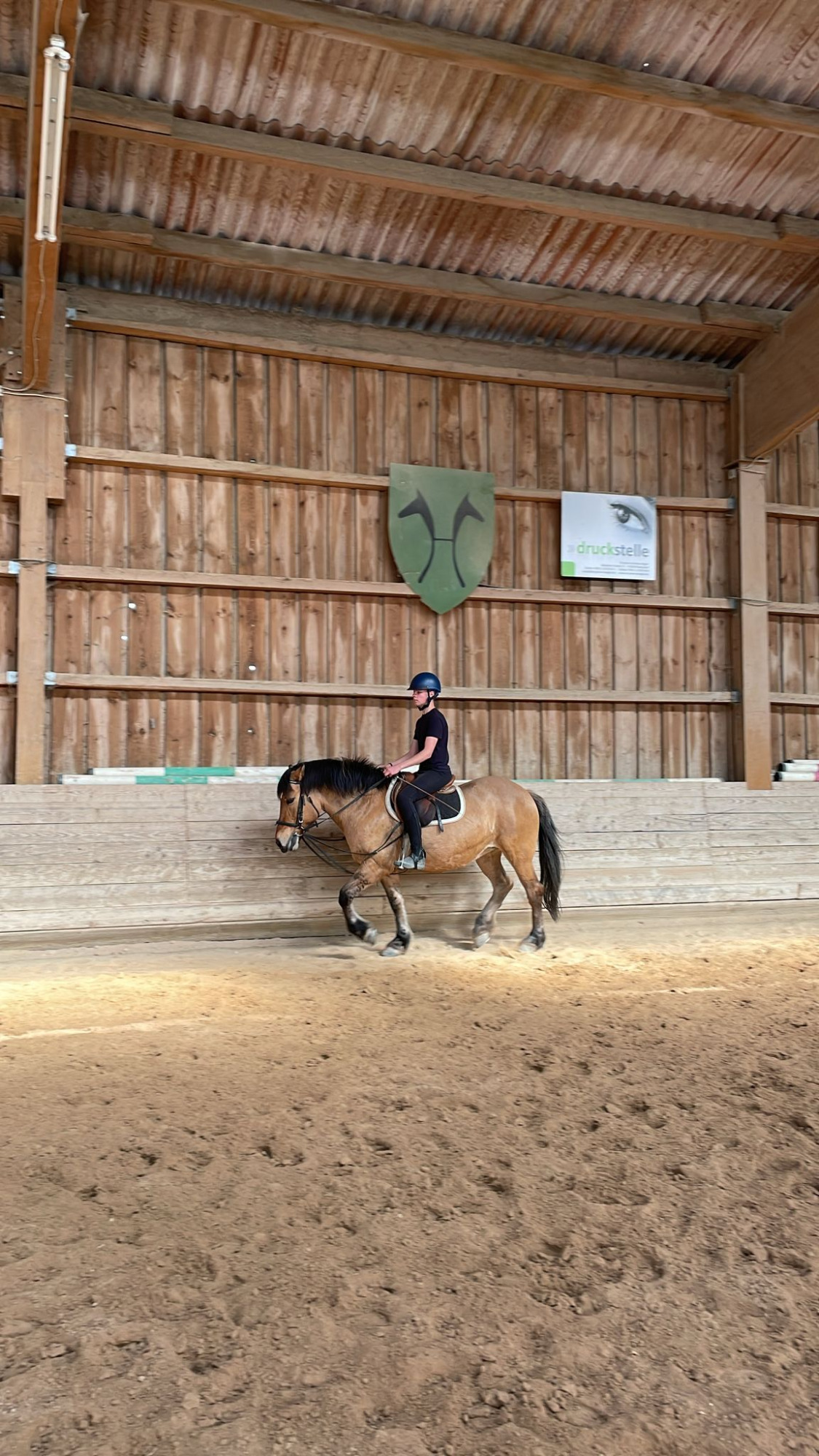 Die Longe um 9 Uhr auf Frieda arbeitete weiter an den Hilfen zum Abwenden. Alle Reiterinnen meisterten die Aufgaben sehr gut!