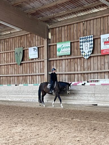 In der Longe um 15 Uhr auf Negro wurde das Vergrößern und Verkleinern von Zirkeln geübt. Esma Ü. konnte dabei große Fortschritte zeigen.