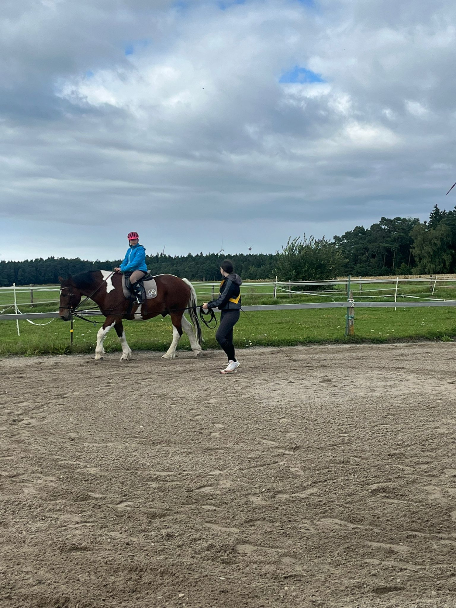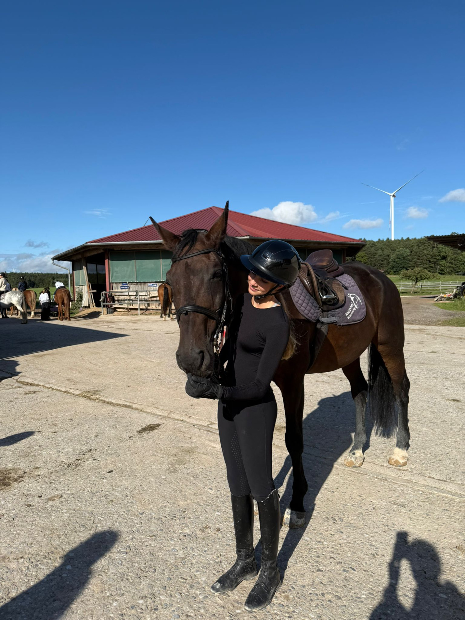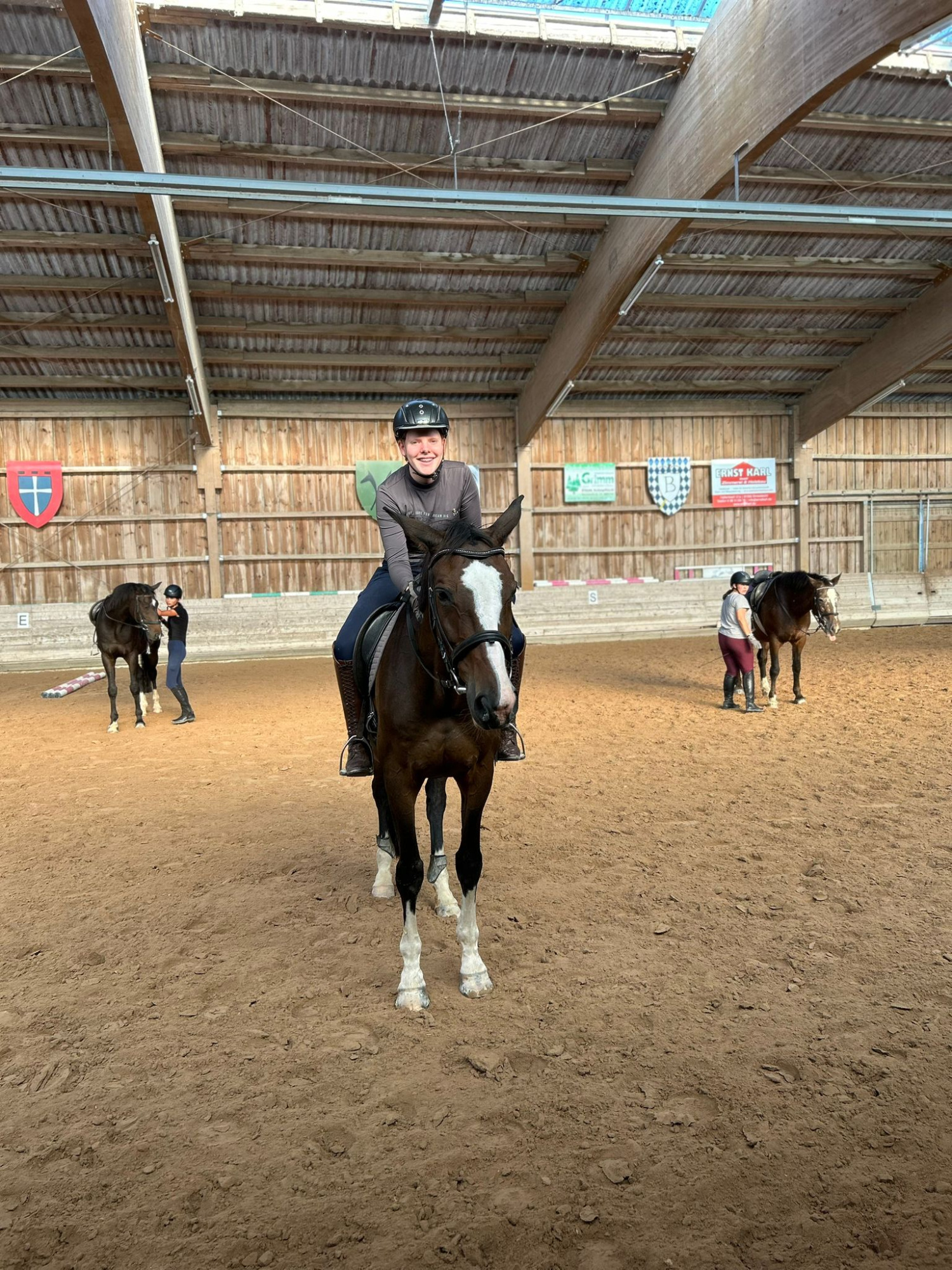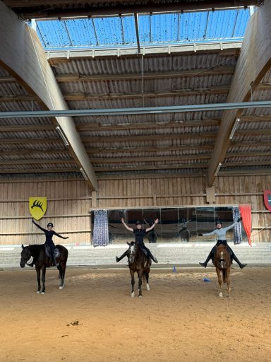 Beim Longenunterricht um 10 Uhr mit Nils standen Bahnfiguren und das Aussitzen im Mittelpunkt. Alle drei Reiterinnen zeigten tolle Fortschritte – man konnte richtig sehen, wie sicher sie schon geworden sind. Am Ende stiegen sie sichtlich zufrieden ab.