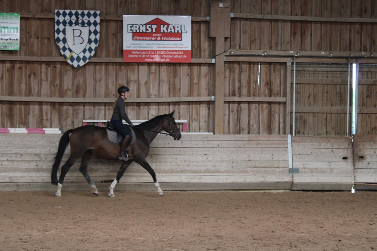Um 9 Uhr an der Longe mit Biene konnte jedes Kind ganz individuell an seinen Themen arbeiten. Sowohl der Takt im Leichttraben als auch das Abwenden wurden geübt. Trotz einer etwas lauteren Geräuschkulisse blieben alle Reiterinnen konzentriert, beruhigten ihre Pferde souverän und machten ihre Sache richtig gut.